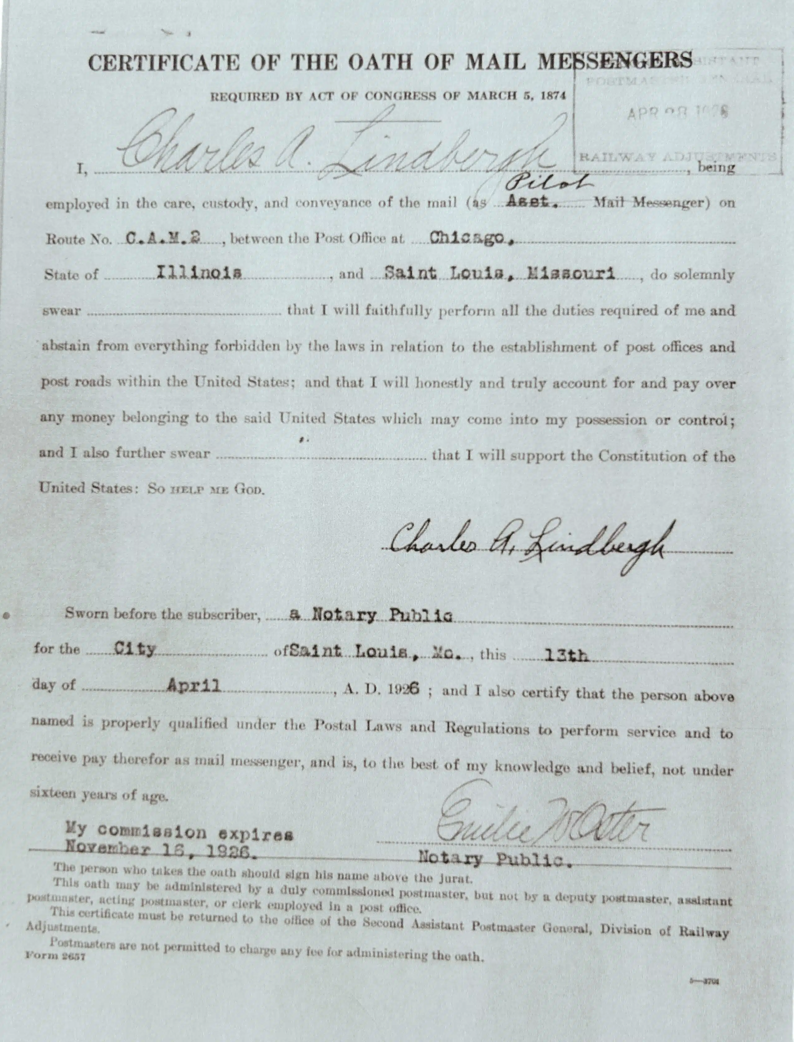 In 1989, the United States Postal Service recognized Krimsky’s preservation of Lindbergh’s historical record with Pan Am by giving him a copy of the certificate oath of mail pilot, signed by Lindbergh in 1926.